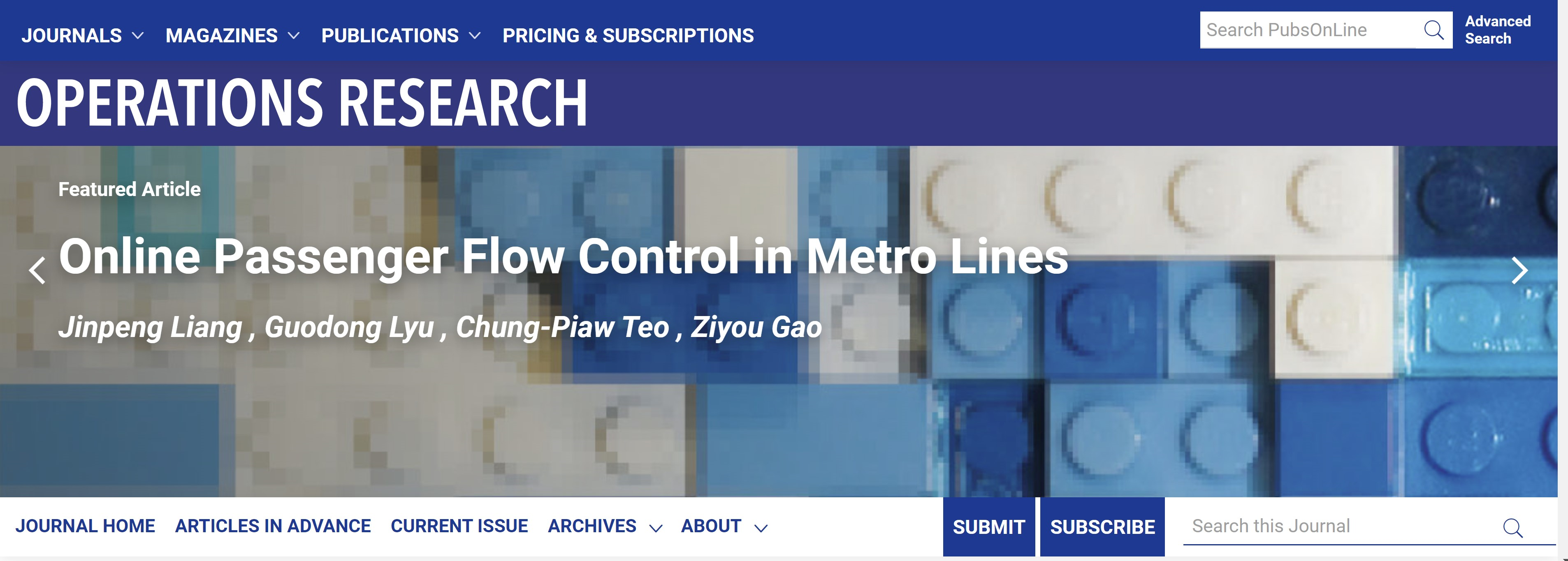 在国家自然科学基金基础科学中心项目和青年基金项目(批准号:72288101,72101042)资助下,swag直播 高自友教授团队与新加坡国立大学张俊标教授团队合作,针对大城市轨道交通的高峰时段客流控制问题开展研究,设计了基于实时需求信息的客流控制策略。该成果以“城市轨道交通在线客流控制(Online Passenger Flow Control in Metro Lines)”为题,于2023年发表在《运筹学》(Operations Research)上,论文链接: //doi.org/10.1287/opre.2022.2417,并被选为当期的两篇亮点论文(Featured Article)之一(如图1所示)。
